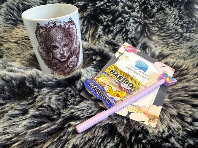 Diese wunderschön gestaltete Tasse zeigt ein einzigartiges Motiv mit einem wunderschönen Gesicht, das von unserer talentierten KI-Künstlerin Gabriella entworfen wurde.